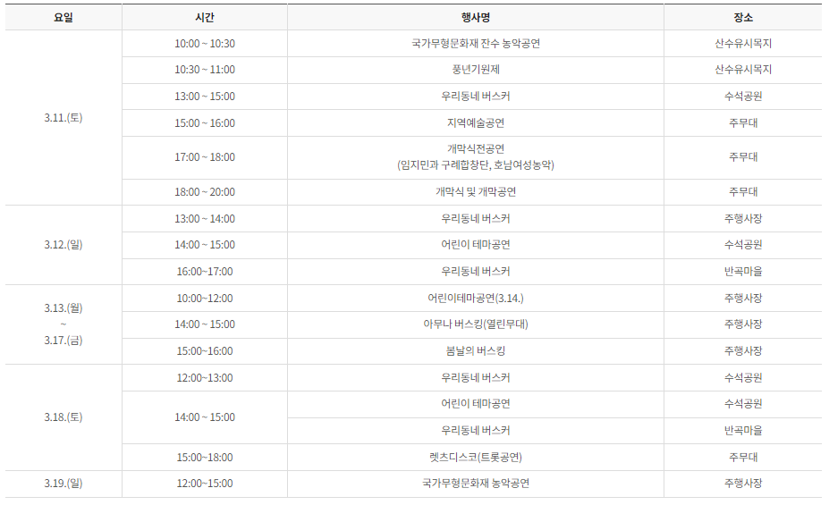 일시 구례 산수유꽃 축제 기간 중 진행됩니다.