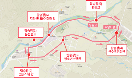 상행선의 경로는 관광안내소부터 시작하여 청소년수련원, 주행사장, 당동로터리, 원좌로터리 순으로 진행됩니다. 하행선의 경로는 원좌로터리에서 시작해 산수유문화관, 반곡, 상위, 평촌교, 관광안내소를 거쳐 다시 평촌교, 관광안내소로 돌아오는 구간입니다.