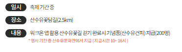 내용 워크온 앱을 활용하여 산수유꽃길을 걷고 완료 시 기념품(산수유건피)을 받을 수 있습니다. 참여자들은 축제 기간 중 산수유문화관에서 기념품을 지급받을 수 있으며, 지급 시간은 오전 10시부터 오후 4시까지입니다.