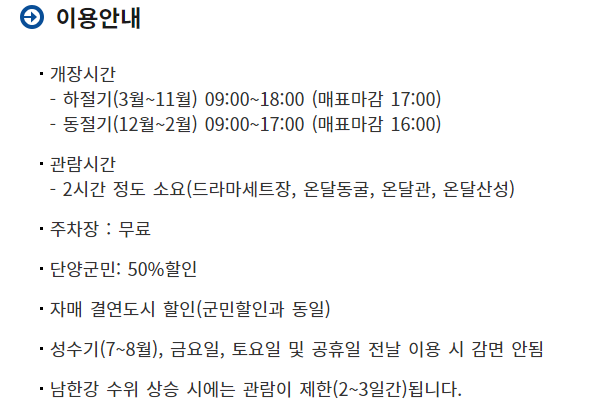 | 할인 | 무 료 : 장애인(1~3급, 본인 및 동반 1인) 50% 할인 : 경로(만 65세 이상), 국가유공자(본인), 단양군민(본인) 25% 할인 : 경찰공무원 및 소방공무원(본인 및 동반 1인), 코레일 당일 승차권 소지자(본인), 내일로 승차권 소지자(본인) 10% 할인 : 단양지역 콘도 투숙객(개인 고객에 한함) ※ 신분증, 영수증 등 증명서를 제시하신 분에 한해 할인됩니다. ※ 중복할인 불가 |