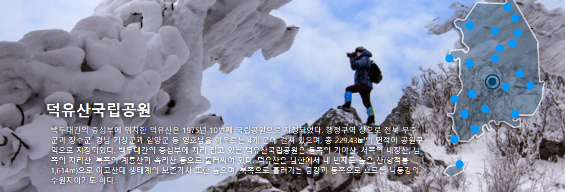 덕유산국립공원 깃대종인 금강모치가 살고 있는 청정한 구천동계곡과 폭포를 볼 수 있는 덕유산의 대표 탐방코스