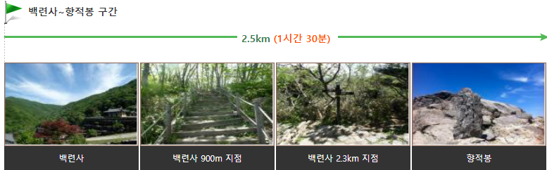 백련사까지 완만한 경사를 따라가는 산책코스로 온 가족이 부담 없이 즐길 수 있는 탐방코스