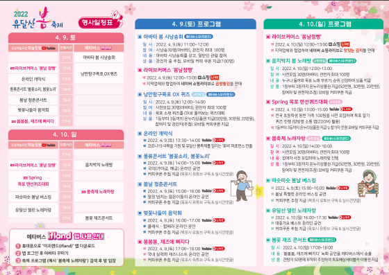 메타버스 봄축제 노래자랑, 봄사연 꽃다발 이벤트 등 다양한 온오프라인 연계 프로그램으로 구성된 이번 유달산 봄 축제는 다양한 문화예술공연과 다채롭고 즐거움이 가득한 이벤트가 있는 이번 축제와 함께 아름다운 봄꽃이 만개한 봄날의 매력에 푹 빠져보시기 바랍니다.