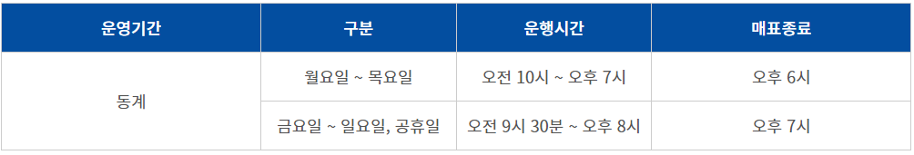 월요일부터 목요일까지 운행시간은 오전 10시부터 오후 7시까지 운행됩니다. 단, 오후 6시까지만 발권이 가능합니다.
