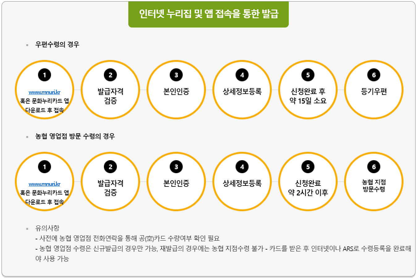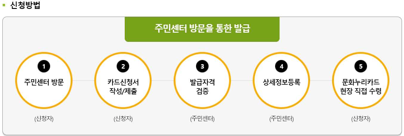 그 후, 주민센터에서 발급자격을 검증하고, 신청자의 상세 정보를 등록합니다. 마지막으로 주민센터에서 직접 문화누리카드를 수령할 수 있습니다.