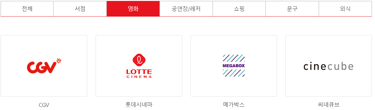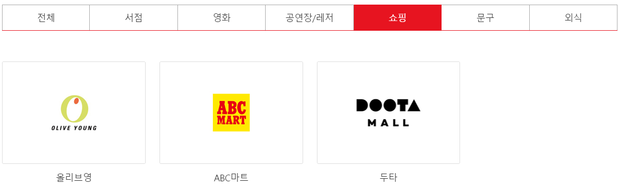 쇼핑몰에서는 ABC마트, 두타, 핫트랙스, 오피스디포, 아트박스, 알파 문구 등 다양한 쇼핑몰에서 사용이 가능합니다.