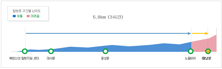 중성문을 지나 대남문까지 약 3km를 걸어서 갑니다. 이 구간은 어려운 난이도로 분류되어 있으며 1시간 30분 정도 소요됩니다. 이 구간에서는 선정비를 비롯한 다양한 유적지들과 노들바위 등이 있어, 역사적인 북한산성의 아름다운 경관을 즐기면서 걷게 됩니다.