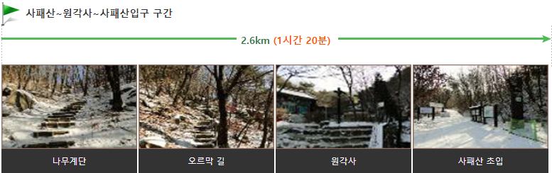 사패산원각사사패산입구 구간은 산행 시간이 약 1시간 50분 정도이며, 원각사에서 조용히 탐방을 즐길 수 있습니다. 이 구간에서는 돌계단과 나무계단을 오르는 가파른 경사로 이루어진 구간이 있으므로, 안전에 유의하면서 탐방해야 합니다.
