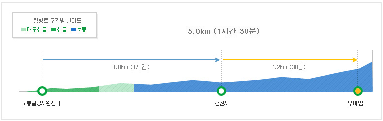 이 코스는 두 구간으로 나뉘어져 있습니다. 첫 번째 구간은 도봉탐방지원센터에서 천진사까지 이어지는 구간으로 약 1.3km 거리이며, 40~50분 정도의 소요시간이 필요합니다. 이 구간은 계단과 흙길이 고루 있으며 경사도 급하지 않아 어린이와 노약자분들이 쉽게 탐방할 수 있습니다.