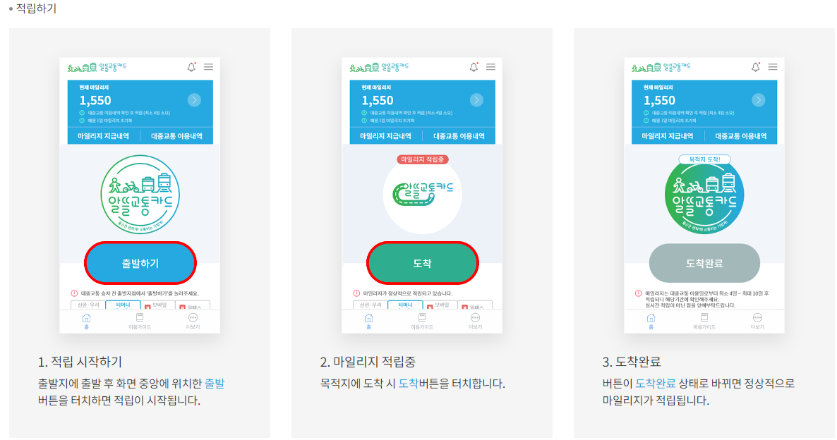 알뜰교통카드 사용 방법은 매우 간단합니다. 먼저, 집에서 출발하기 전 앱 내 '출발' 버튼을 클릭합니다. 그 후, 도보 또는 자전거로 이동한 후, 알뜰교통카드나 모바일 알뜰교통카드로 교통비를 지불합니다. 목적지에 도착한 후에는 '도착' 버튼을 클릭하면 됩니다. 출발 또는 도착 버튼을 누르지 못한 경우에도 최소 마일리지 50원이 적립됩니다.
