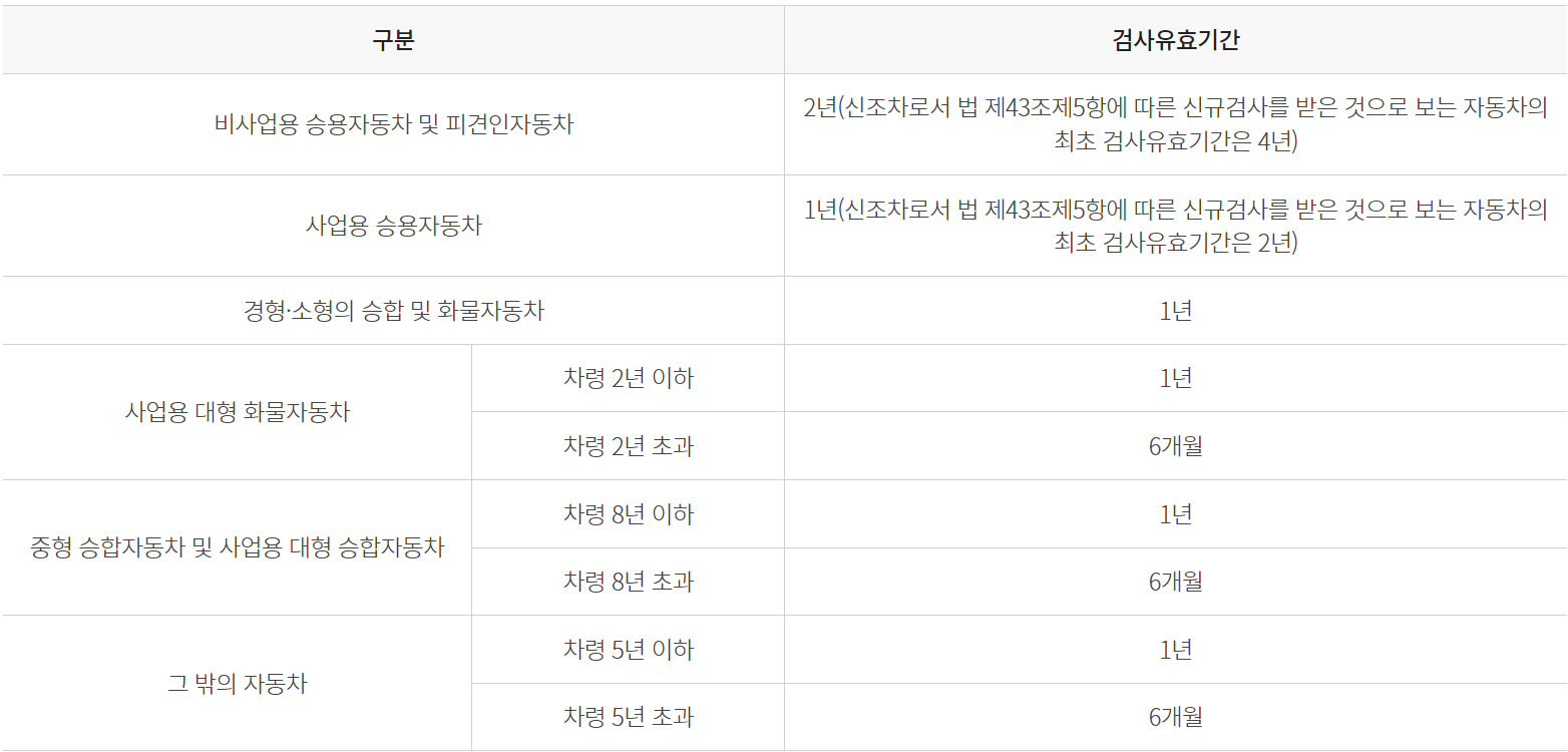 검사 종류로는 정기검사, 종합검사, 신규검사, 튜닝검사, 임시검사, 수리검사, 이륜차검사, 택시미터 사용검정 등이 있으며, 검사 유효기간 내에 받지 않을 경우 60만원 이하의 과태료가 부과됩니다.